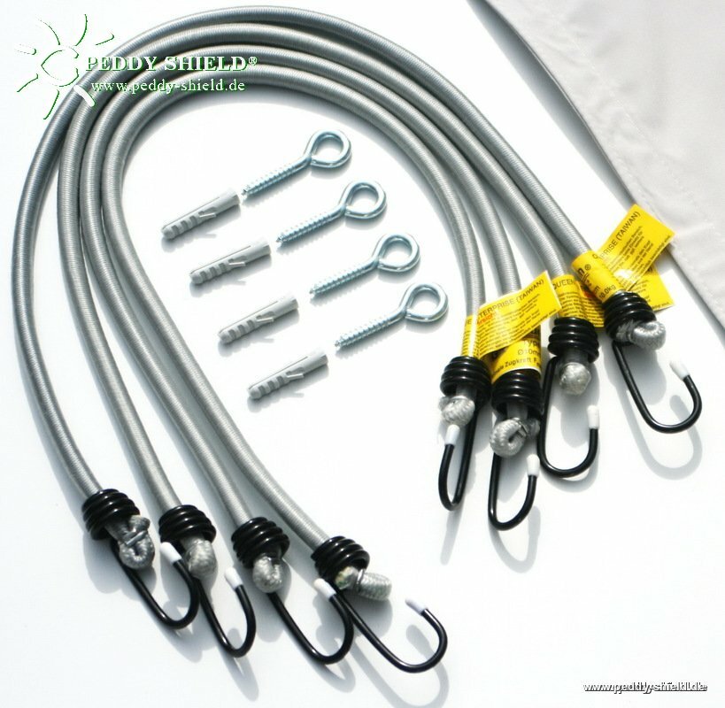 Dauerelastische Spanngurte /4x) für Vierecksonnensegel zusammen mit allem Montagagematerial.
